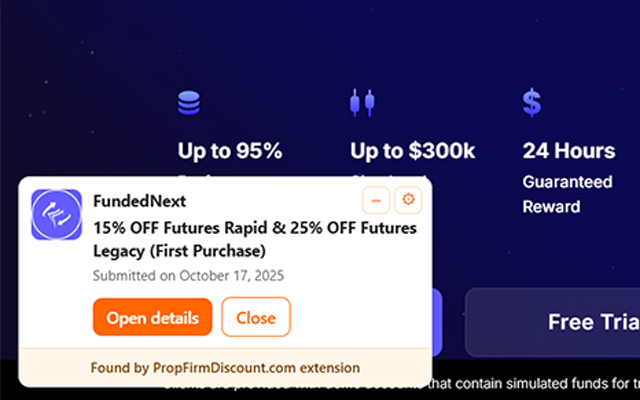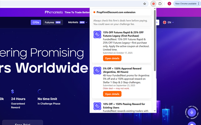 - When you visit a supported prop-firm website (e.g fundednext.com, ftmo.com, v.v..), a compact on-page bubble appears with the latest offers.